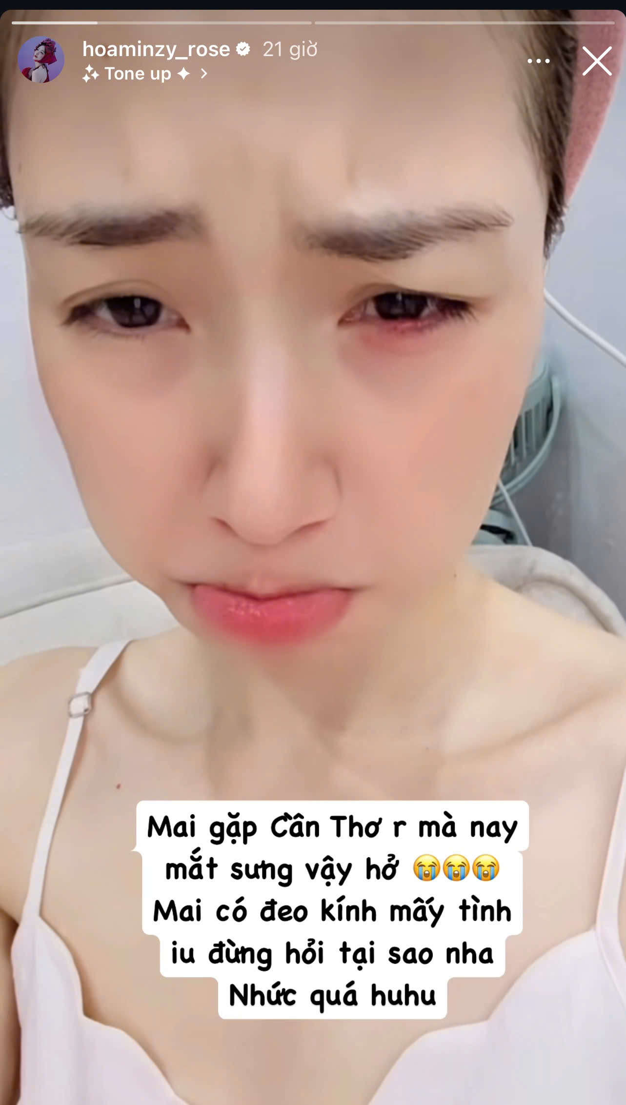 Trên trang cá nhân, Hòa Minzy viết: “Mai đã hẹn gặp khán giả Cần Thơ rồi mà mắt lại sưng thế này. Mong mọi người thông cảm nếu ngày mai tôi phải đeo kính khi biểu diễn nhé. Thật sự rất nhức. Đành phải mang đôi mắt sưng húp này lên sân khấu thôi. Đúng là khổ sở!”. Tình hình sức khỏe hiện tại của giọng ca sinh năm 1995 đã khiến nhiều người hâm mộ không khỏi quan tâm và lo lắng.